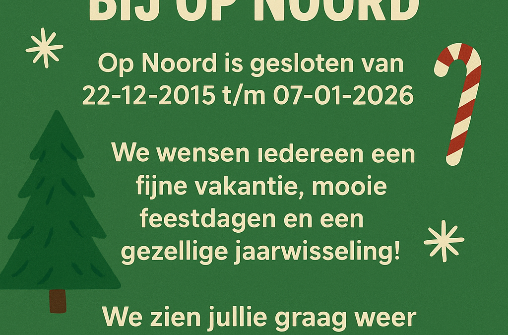 Kerstvakantie door Pascal Donders | dec 7, 2025 | Geen categorie Zondag 21 december gaan we 2 weken dicht voor de kerstvakantie. Op Noord wenst iedereen hele fijne dagen en een gelukkig nieuwjaar! Paviljoen Op Noord, het beweegplein en midgetgolf zijn woensdag 7 januari 2026!
